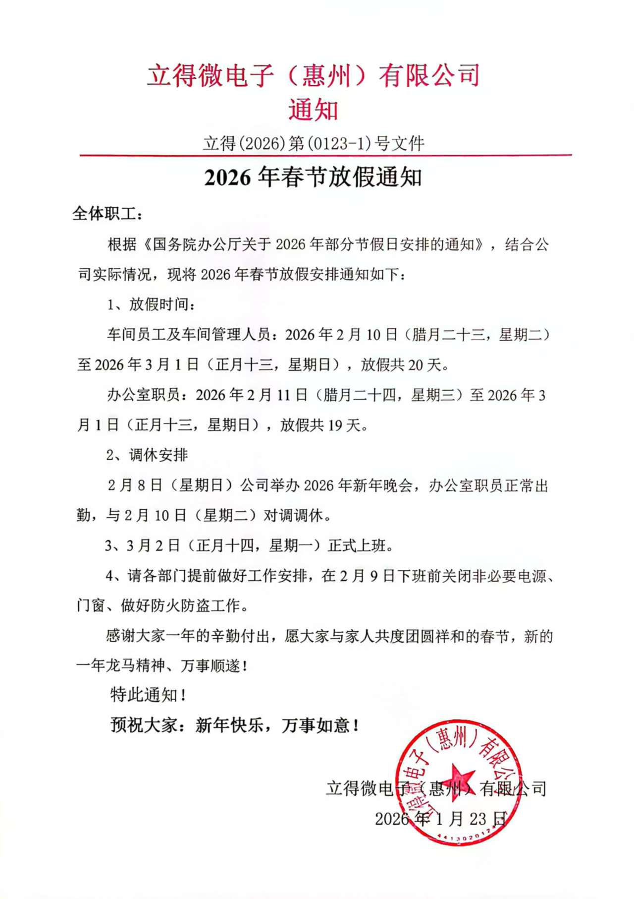 立得 2026年春节放假通知